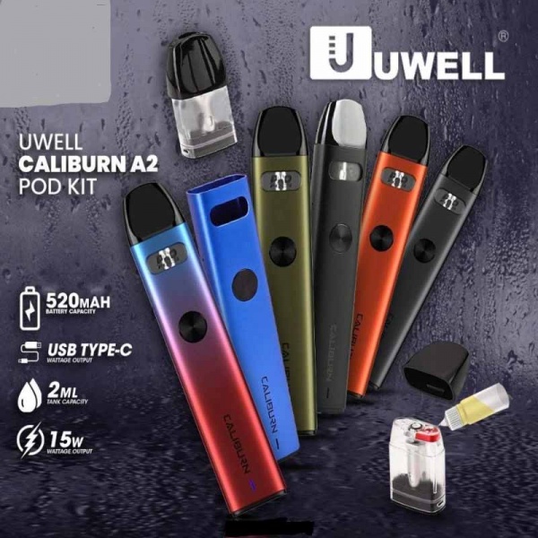 UWELL CALIBURN A2 KIT (15W) uses new Cliburn A2 Cartridge which adopts top filling system, and has a visible window through the mod to make the e-liquid check easy. With PRO-FOCS technology, the built-in FeCrAI UN2 Meshed-H 0.9 Ω Coil can bring you authentic flavor. The device supports both direct draw and button draw, outputs at power 15W by 520mAh built-in battery. Last but not least, the mod is made of Aluminum Alloy material which is smoothing, polishing and comfortable grip.